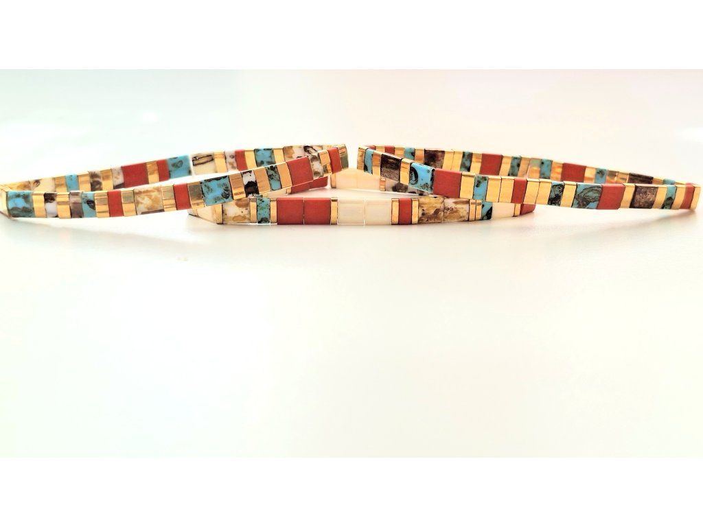 Nadčasová farebná kombinácia: terakotovej, tyrkysovej a bielej perlete s jemnými zlatými akcentami, ktoré ladia s každým outfitom – od každodenného po elegantný večerný look.